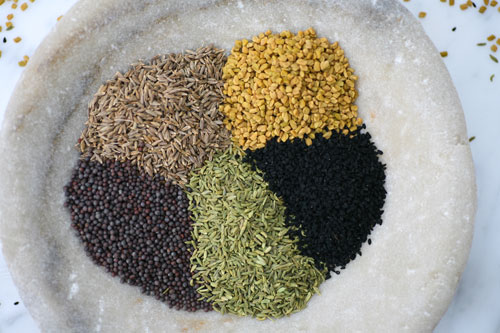 A blend of spices like fennel, cumin, nigella, fenugreek, and mustard seeds, used for tempering.